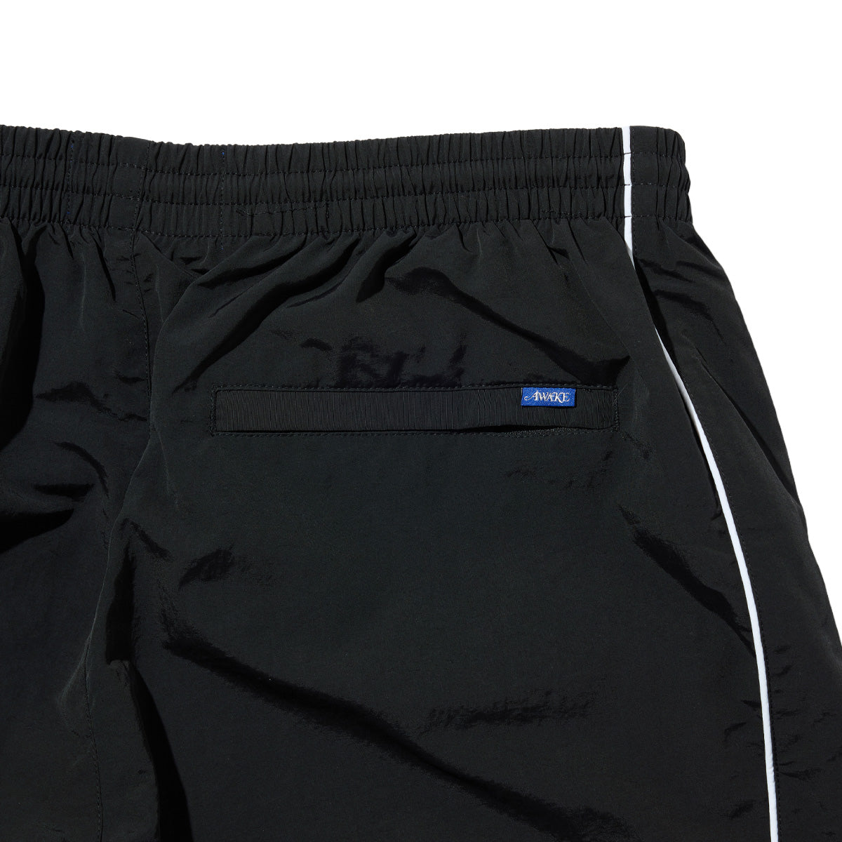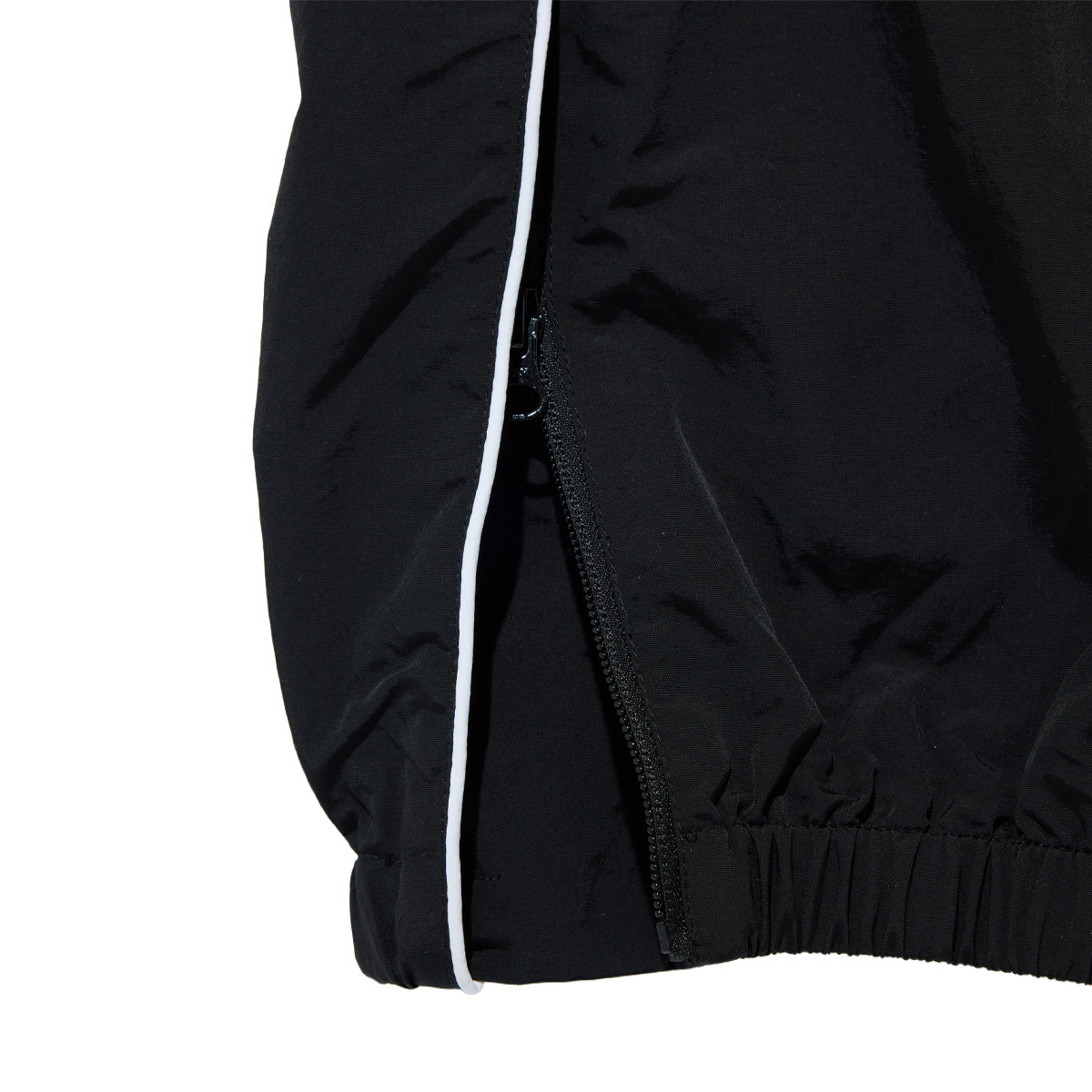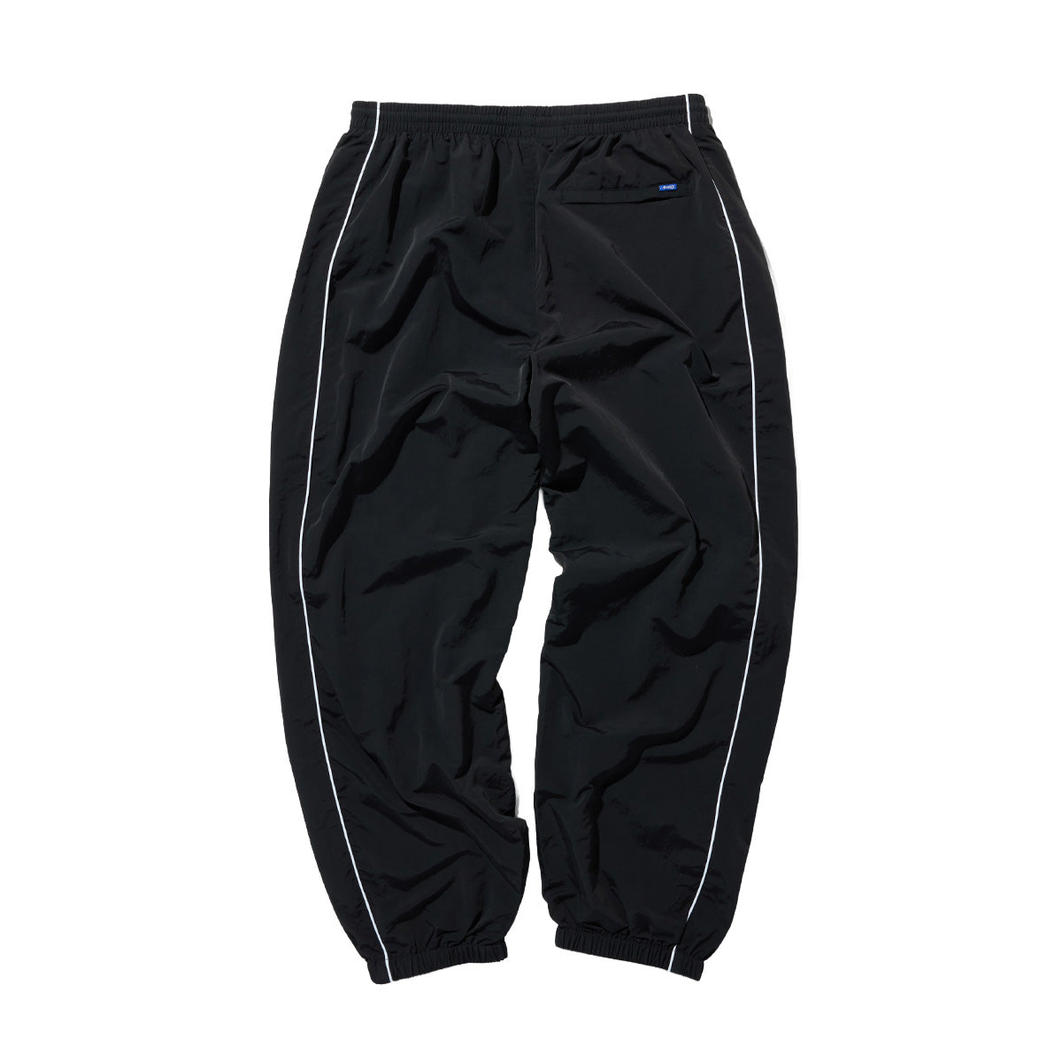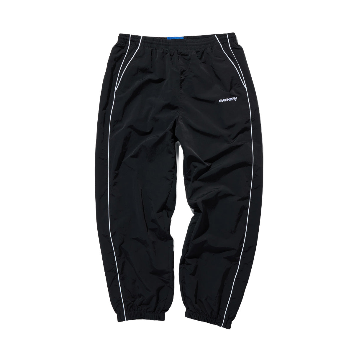 Nylon double panel track pant with adjustable drawcord hem and logo patch.