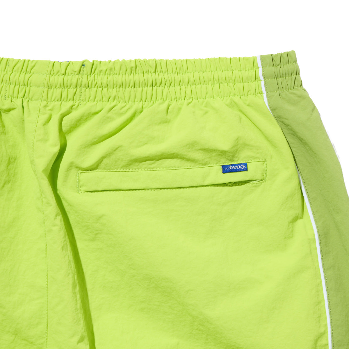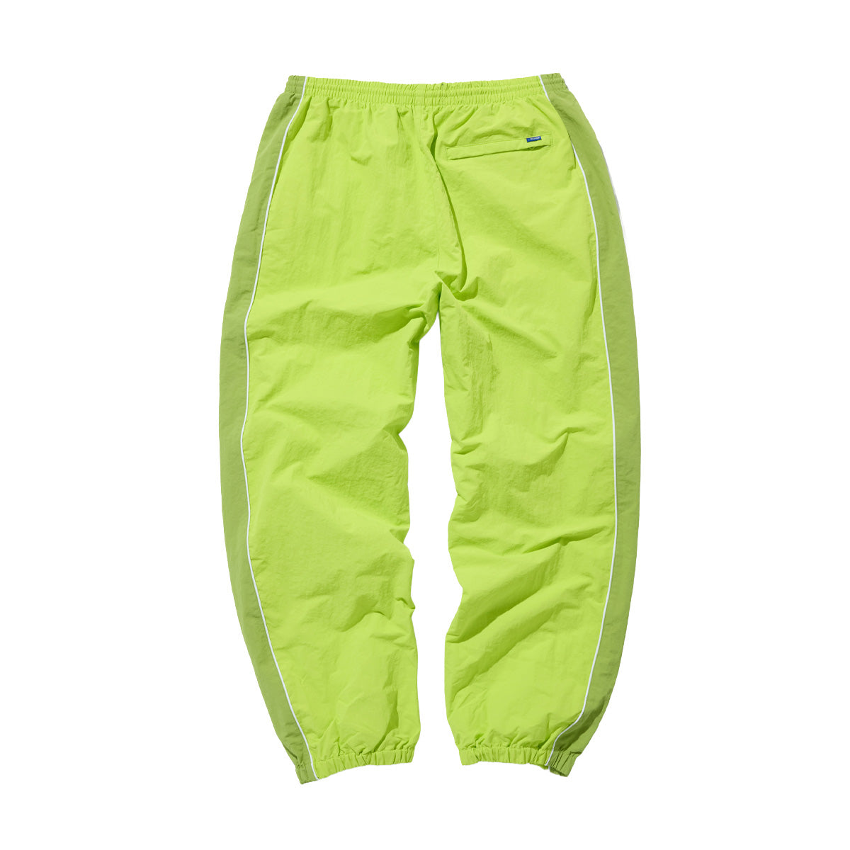 Nylon double panel track pant with adjustable drawcord hem and logo patch.